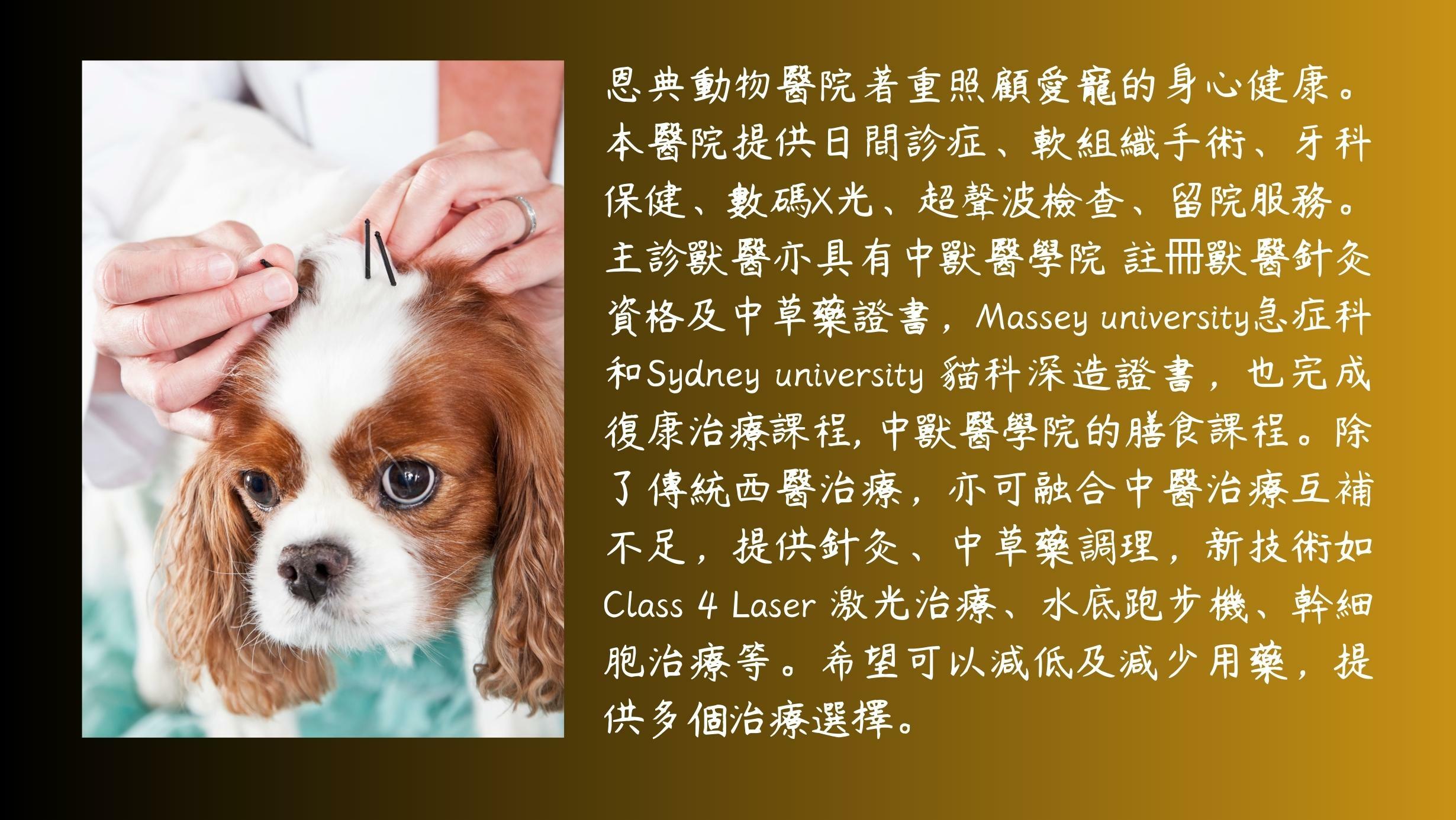 恩典動物醫院 著重照顧愛寵的身心健康。本醫院提供日間診症、軟組織手術、牙科保健、數碼X光、超聲波檢查、留院服務。